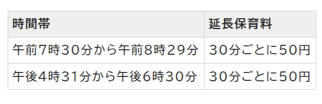 保育短時間(8時間)を超えて保育標準時間(11時間)までの利用:30分ごとに50円