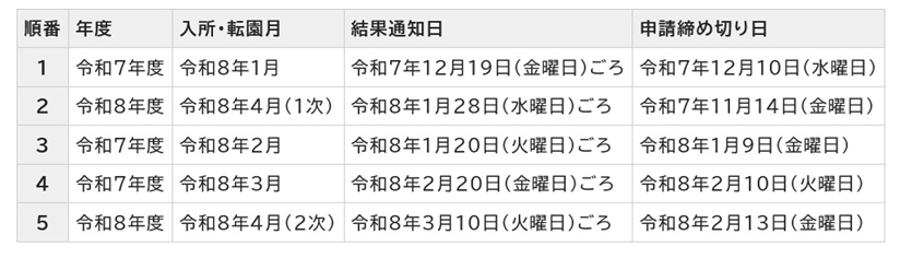 ※令和8年4月(1次)と令和8年2月の結果通知は同時期ですが、転園決定は令和8年4月(1次)が先となります。そのため、令和8年4月(1次)で転園決定した場合は、令和8年2月の転園申請は自動的に取り下げとなります。