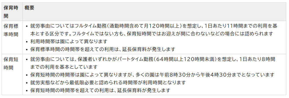 2号認定・3号認定では、保育事由などから「保育標準時間」と「保育短時間」のいずれかに区分されます。この区分は、延長保育料にも影響します。