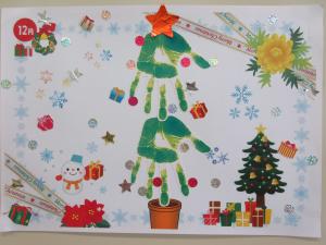 子どもの足形でクリスマスツリーを表現し、好きなシールでオーナメントを貼り付けます。