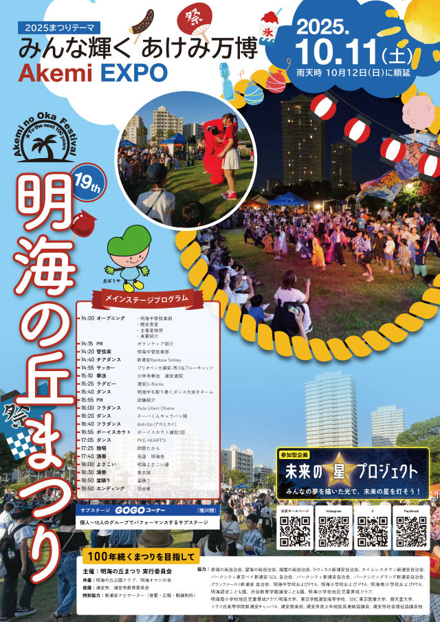 主催:明海の丘夏まつり実行委員会開催日:2025年10月11日(土)開催時間:14:00~20:00 ※雨天の場合は、2025年10月12日(日)に順延 -