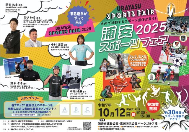 【主催】浦安市・浦安市教育委員会 【主管】一般社団法人浦安市スポーツ協会開催日:2025年10月12日(日)開催時間: 午前9時30分 ~午後3時30分 ※開会式は午前9時15分から ※室内のみ雨天決行 -