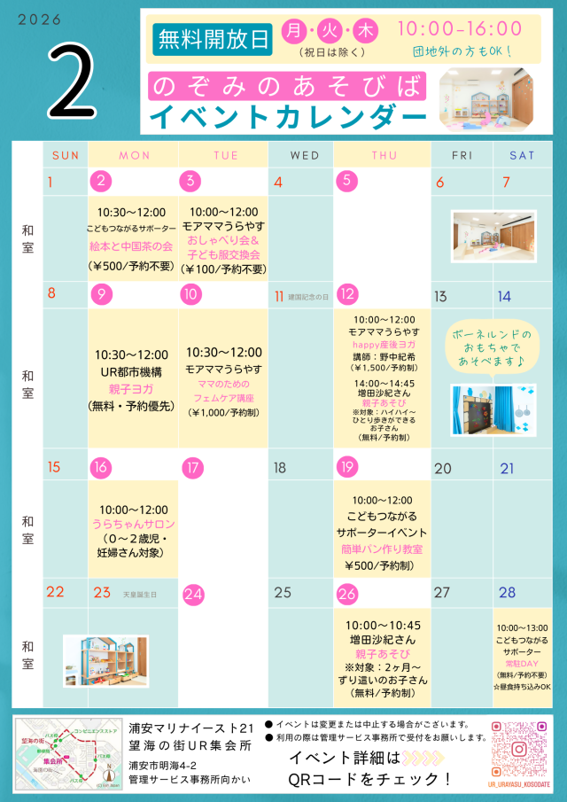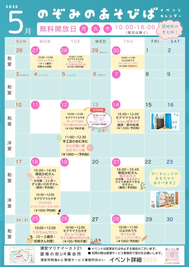 のぞみのあそびば無料開放日(祝日を除く)(浦安マリナイースト21望海の街)主催:UR都市機構