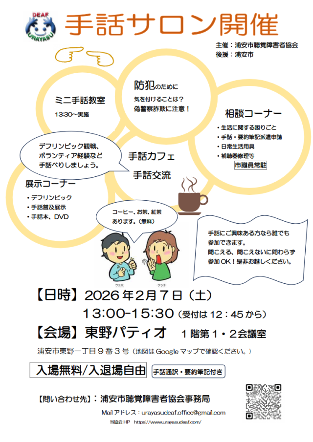 主催:浦安市聴覚障害者協会開催日:2026年02月07日(土)開催時間:午後1時~午後3時30分(受付は午後0時45分~) -