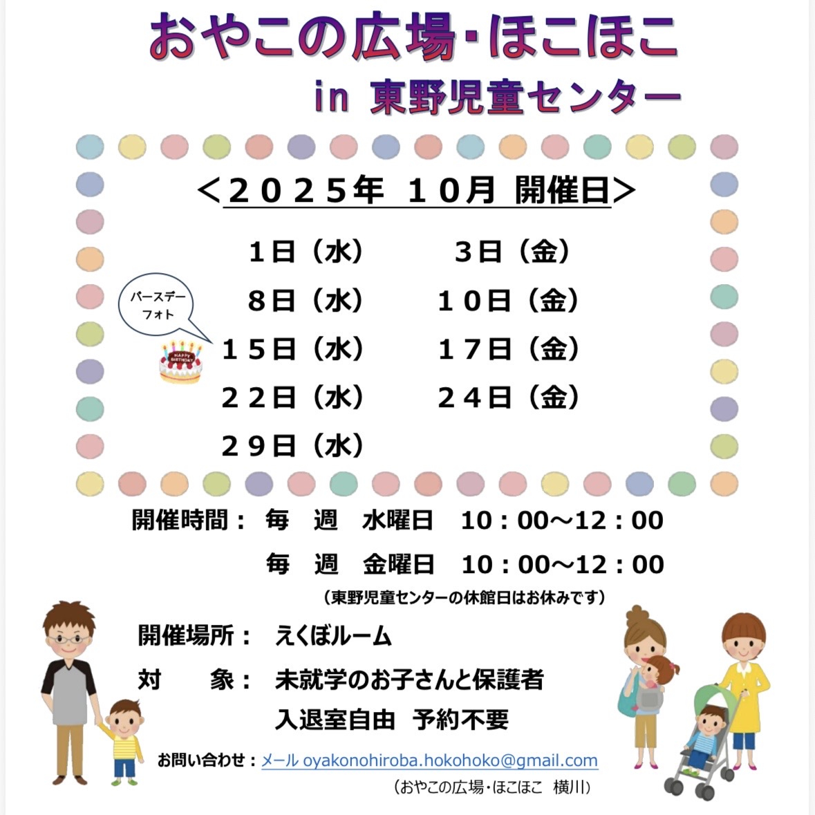 問い合わせ先 | 「おやこの広場・ほこほこ」 oyakonohiroba.hokohoko@gmail.com(担当:横川) |