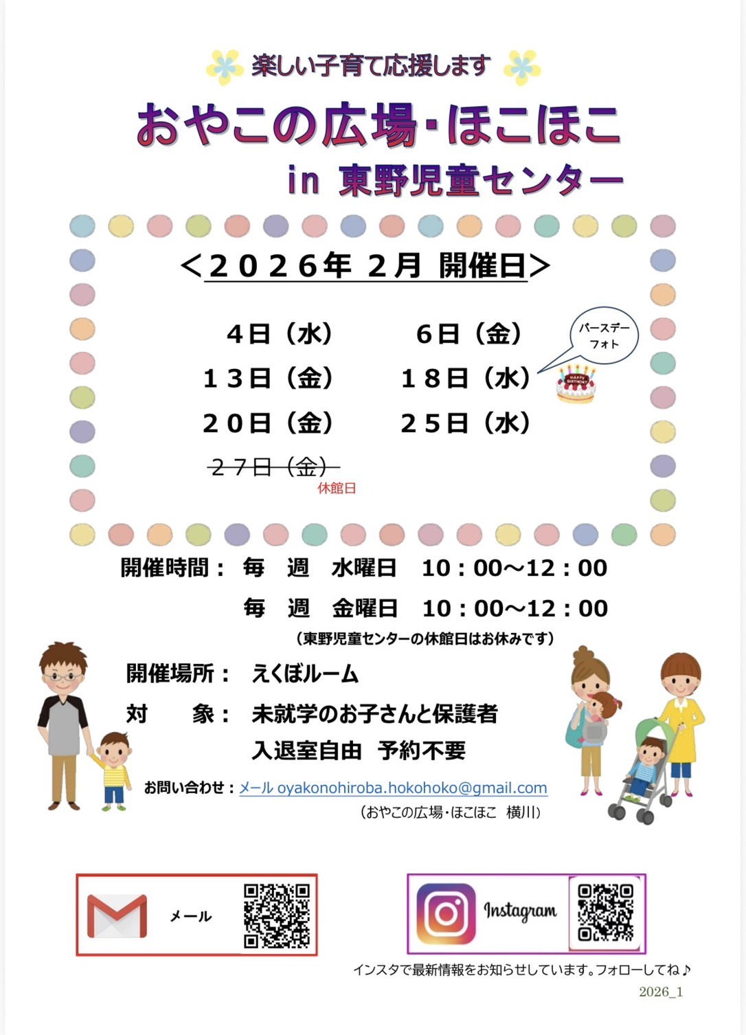 | 問い合わせ先 | 「おやこの広場・ほこほこ」 oyakonohiroba.hokohoko@gmail.com(担当:横川) |