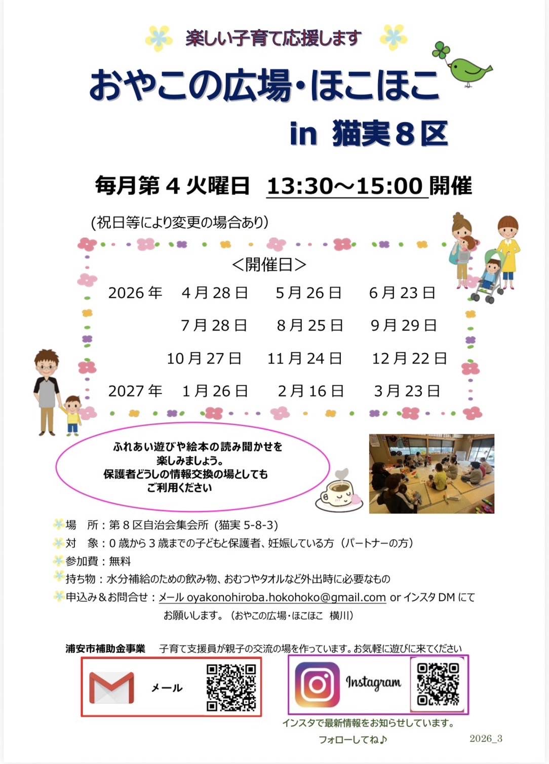 【要予約】4月「おやこの広場・ほこほこin猫実」(第8区自治会集会所 )