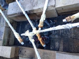 長い棒にパン生地を巻き付け、かまどで焼きます。 -