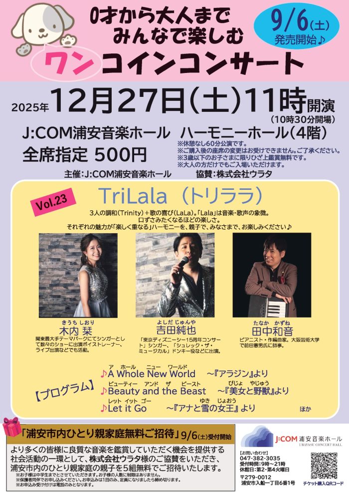 | イベント・講座名 | 【要申込】0才から大人までみんなで楽しむワンコインコンサートVol.23 「TriLala(トリララ)」(J:COM浦安音楽ホール) |